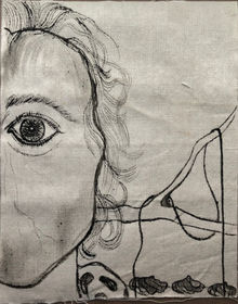 charcoal from burned leaves in egg tempera, dirt in egg tempera, pencil, watercolor, stitching,